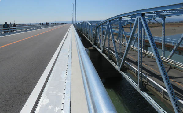 新橋から見た旧橋旧橋は昭和9年竣工。橋の中央部10径間は垂直材付き下路式鋼曲弦ワーレントラス橋。側径間はゲルバー式プレートガーダー。部材の接合方法はリベット接合。貴重な土木遺産です。今年84歳の老兵もその役目を終えて、新橋にバトンタッチです。旧橋は、平成30年度から4ヶ年をかけて順次撤去予定とのことです。 |