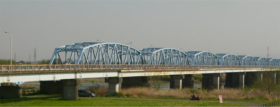 | 伊勢崎市で利根川を渡る最南端の橋・上武大橋。竣工は昭和9年4月です。橋長894.7m、有効幅5.5m。完成当時は中瀬橋を抜いて埼玉県下第2の長大橋になったようです。 この橋の形式は中央径間が鋼曲弦ワーレントラス、側径間が鋼ゲルバー桁、部材の接合はリベットです。 最近の長大スパンの橋はスマートな斜張橋や吊橋、あるいはアーチ形式になることが多く、これらの形式や接合方法が現存する上武大橋は非常に珍しく、その風貌から感じるレトロ感と頑固でどっしりとした存在感は貴重と思います。 上流の伊勢崎・本庄間を結んでいた坂東大橋の中央部も同じ形式でしたが、そちらは2004年春に新しく鋼斜張橋に代わりました。(2007/5/8 記) |