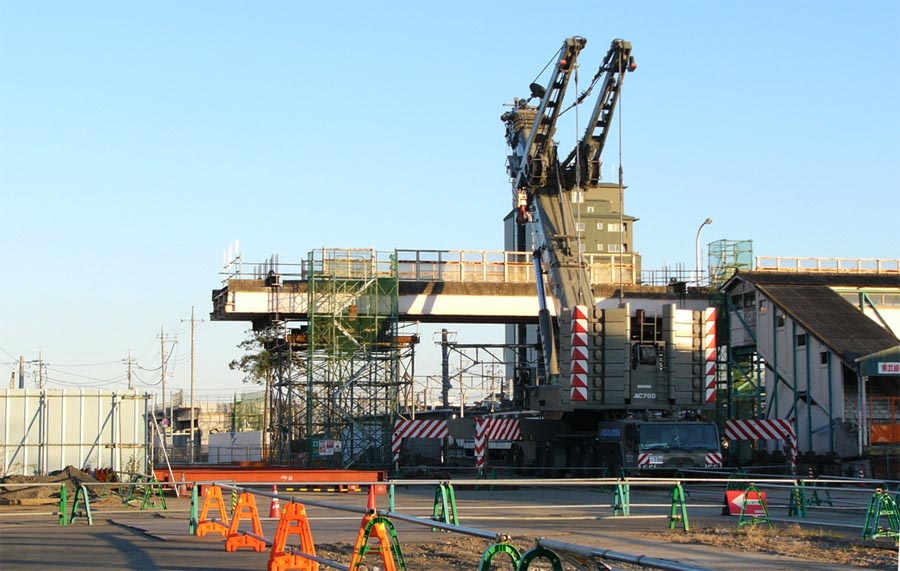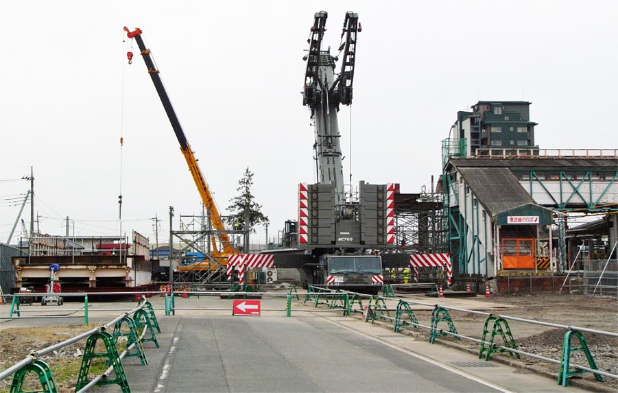 跨線橋の西側にクレーン設置DEMAG AC700TADANOが2019年、TEREXコーポレーションからDEMAG(デマグ)・モバイル・クレーン事業を買収。![]() 南北連絡跨線橋と桁吊り上げ撤去用クレーン 2007/11/23 ![]() クレーン本体の両側に幅広くアウトリガーを設置 2007/11/23 ![]() 両手を上げて咆哮するクレーン型トランスフォーマーのよう 2007/11/23 北半分の桁を撤去完了![]() 跨線橋の北半分を撤去。残るは南半分。 2007/11/27 ![]() 跨線橋の北半分を撤去。駅ホーム間の跨線橋は残っていますが閉鎖しています。2007/11/27 |
