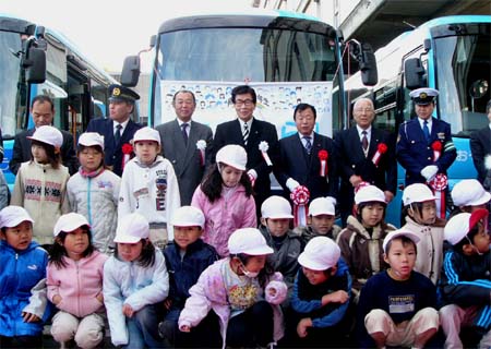 ![]() 出発式終了後、バス試乗会に参加した南小児童たち みんな元気一杯!ワ〜、ピース、ピース♪ |