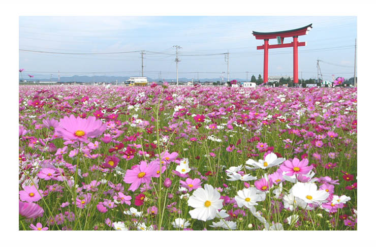 | 2010/10/16、あずま「コスモスまつり」の初日、10月の中旬ながら長袖ではちょっと暑いくらいのこの日、あずまの小泉稲荷の大鳥居周辺では、ピンクや臙脂、白のコスモスが咲き乱れて見渡す限りの畑一面を覆い、大袈裟でなくコスモスの大海原を創り出していました。ここ5年間、コスモスをカメラに収めていますが、今年は今までで一番いい日に恵まれたように思います。 イベントは17日(日)がメインですが、この日も大勢の来場者が訪れ、畑の中に作られた散策道を歩いたり、この日から自由になったコスモスの摘み取りを楽しんでいました。 (2010/10/18 記) |