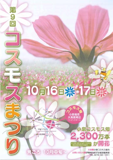 | 「あずまコスモスまつり」は旧・群馬県佐波郡東(あずま)村の小泉稲荷大鳥居の周辺で毎年10月中旬に行われます。 この辺の休耕田を利用してコスモスを咲かせるようになったのはいつの頃からだったでしょうか。大鳥居をくぐる道路を通るたびに「お〜、今年も咲いている!」と感激し、車のスピードがついついゆっくりとなります。 初めて気が付いた数年前に比べ、今ではその範囲が広くなり、見渡す限り色とりどりのコスモスの花で埋まっています。まつりでは幟が立ち、テントが張られ、露店も並び、臨時駐車場も作られ、見晴台も作られます。爽やかな秋の気候の下でコスモスに囲まれて癒しの時間を過ごすことができます。 ピンク、白、紫、えんじの混合の畑と、オレンジ色一色の畑が分かれていて、遠めに目を引くのはオレンジ一色ですが、変化があって楽しいのは色々な色が混じった畑でしょうか。(2006/10/14 記) |