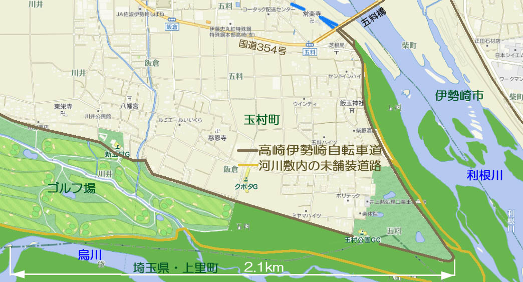 | ―:利根川自転車道 ―:桃の木川サイクリングロード ―:広瀬川サイクリングロード ―:高崎伊勢崎自転車道 |