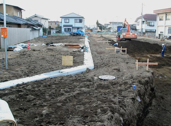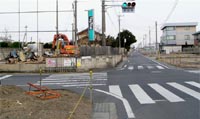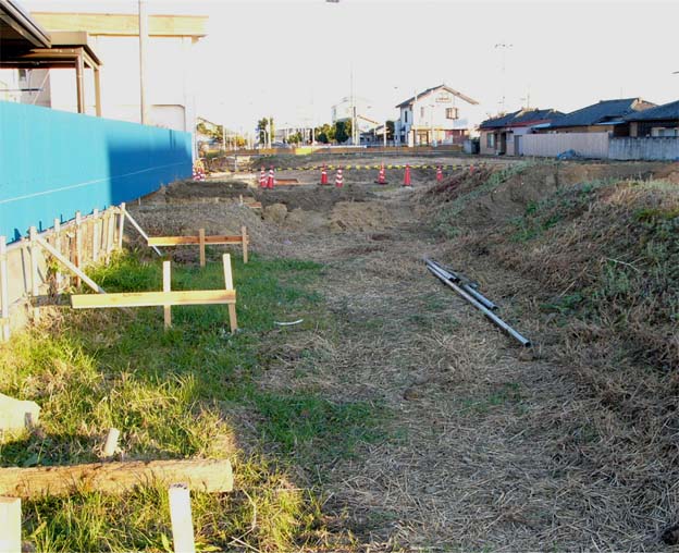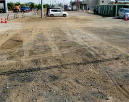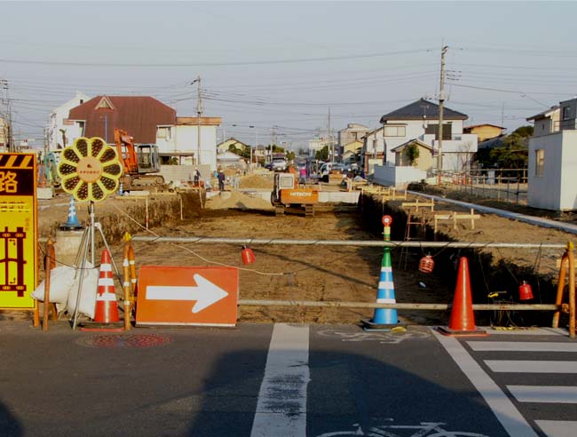 ![]() 六間道路すぐ西側の路床工事 後方が六間道路 |