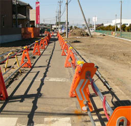 ![]() 末広町の交差点のすぐ東。左が現道。確保した用地がパイプで囲われています。 左端のブロック塀は富士重工 |