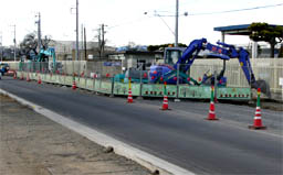 ![]() 路盤を整地、転圧中の車道部と建設機械。 タイヤローラ(左後方)、油圧ショベル(左側)、モータグレーダ(右側) 末広町交差点から西方 2010/7/31 |