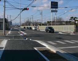 | 安堀町・美茂呂町線の大胡県道の交差点が2010年11月下旬に開通しました。大胡県道側は隅切り部の改良のみですが、安美線側は右折線付きの交差点です。(2010/12/13 記) | ![]() |