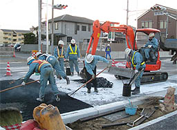 拡幅部(車道部+歩道部) ↓ ![]() KOMATSU・モーターグレーダー(*) (*)路床・路盤の整地作業で活躍します。 |