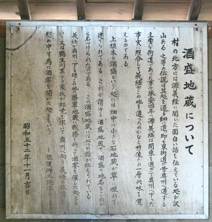 【標識を転記】 一里塚の所へさしかかった義経は、のどが渇いてきたので弁慶に水を探させたところ、天からお告げがあったのです。 「汝の立つ所、力強く叩いて見よ。そこに泉あり」 とお告げ通り大地を七つ道具の一つ掛矢で力強く叩いた所、不思議にそこからこんこんと水が湧き出してきたので、義経にその水を飲んでもらったのでした。 義経はたいそう喜んで、それ以来この清水を弁慶の掛矢清水と呼ぶようになったといいます。 (この清水は北関東自動車道の道路敷きになったので、今は場所だけがわかっている) 元文書上帳による 伊勢崎市殖蓮史談会 |