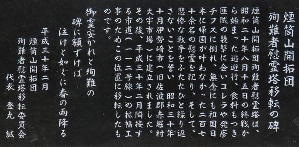 ![]() 碑文 2018/1/9 ![]() 煙筒山開拓団 殉難者慰霊塔移転の碑 2018/1/9 ![]() 煙筒山開拓団 殉難者慰霊塔移転の碑。右側:市道(赤)112号線。 2018/1/9 ![]() 碑文全文 2018/1/9 |