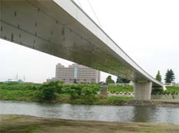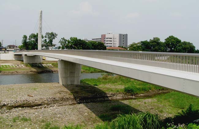 ●本体工事 工事費:2億5,987万5千円 工期:2008年5月30日 ●附帯工事 ■橋面工事(高欄、親柱、舗装) ■照明工事(取付道路照明、ライトアップ) ■取付道路築造工事(防護柵、道路築造、舗装、西部公園内整備) 工事費計:1億712万5千円 全体完成:2008年7月(予定) ●橋の寸法諸元 ■形式:鋼斜張橋 ■橋長:158.5m ■有効幅員:4.0m ■歩行者専用(自転車、車椅子も可) |