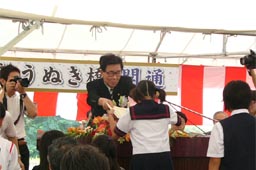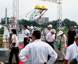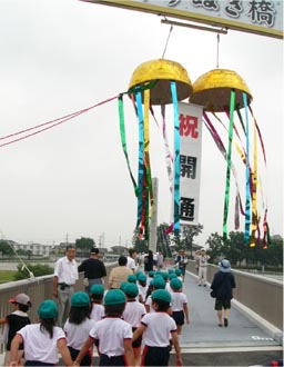 ![]() うぬき橋の南側袂では クス玉が開被を待つばかり ![]() 市長さんたちがテープカット 名付け親たちがクス玉開被 |