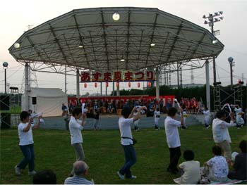 | 夕闇が降りて来る頃、提灯やライトの灯りが会場を照らし、夏祭りの雰囲気をかもし出します。 舞台では八木節が更に続き、その前の広場でも皆さんが踊っています。 |