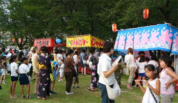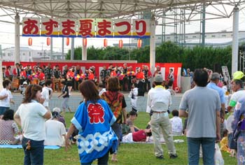 2007年の「あずま夏まつり」は8月4日(土)の15:00〜20:30の間に行われました。会場は「あずま総合運動公園」です。 私は夕刻の5時過ぎに出かけました。夏の陽は夕方5時と言ってもまだ昼間と同じです。 運動場の野外ステージではちょうど八木節が始まり、舞台の上からは木の樽を叩きながらの八木節の威勢のいい歌声が響き渡り、その前では赤や紺の半被に身を包んだ踊りチームが色取り取りの番傘をクルリクルリと回転し、歌に合わせて元気に踊っていました。 舞台の前の広場でも多くの人が輪になって八木節調?盆踊りを楽しそうに踊っていました。踊り手はみなさん女性でした。 |