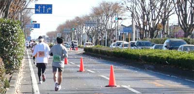 | 5kmコースは伊勢崎PAの南西の信号を左折し、南に緩やかな下り勾配を走り、グリーンパークの西側を通り、特別擁護老人ホーム「ことぶきの郷」の南の信号を左折し、陸上競技場のゴールへ向かいます。この区間を走るのは5kmコースのみです。 背中に赤城山を擁し緩やかな下り勾配(この2つの信号間の高低差は約5mあります)を走るので、傍目には快適な区間ですが、ランナーの皆さんは一所懸命でした。 |