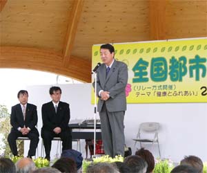| 式典の会場は園の中央部の「みんなの広場」の北東に新らしく作られた「イベントステージ」です。 爽やかなコーラスの余韻が会場に残る中、いよいよ式典開始です。 まずは、矢内伊勢崎市長さんよりご挨拶。矢内市長は「第25回全国都市緑化ぐんまフェア伊勢崎市実行委員会」の会長を務めています。 |