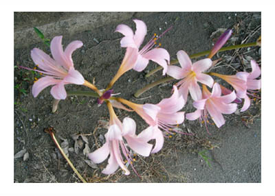 | いかにも涼しそうな名前”夏水仙”。8月中旬頃から下旬にかけて咲き、ヒガンバナ同様、花期には葉は消え、スッと伸びた花茎と薄ピンクの花だけが姿を見せます。その分、いかにも涼しそうで、夏水仙とは良く命名したものだと感心します。 この夏水仙・リコリス・スクアミゲラに最初に出会ったのは4年前の夏、赤堀の国道50号南側の路傍で咲いていました。その風情はいかにも涼しそうで可愛らしく、素通りを許しませんでした。 以来4年間、お盆を過ぎる頃から、郊外へ外出する度に気にかけていますが、ヒガンバナ程には見つかりません。そんな夏水仙、昨日、境西今井の道路脇の畑で咲いているのに出会いました。たった3本でしたが、周囲に何もない乾いた風景の中で咲く姿は、十分に存在感がありました。(2014/8/20 記) |
