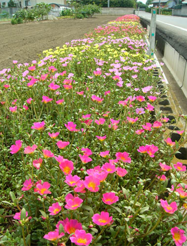 ![]() 道路の両側を可愛らしく彩るポーチュラカ(前橋市下増田町)。この先の木三橋を渡れば伊勢崎市。 2013/9/1 |