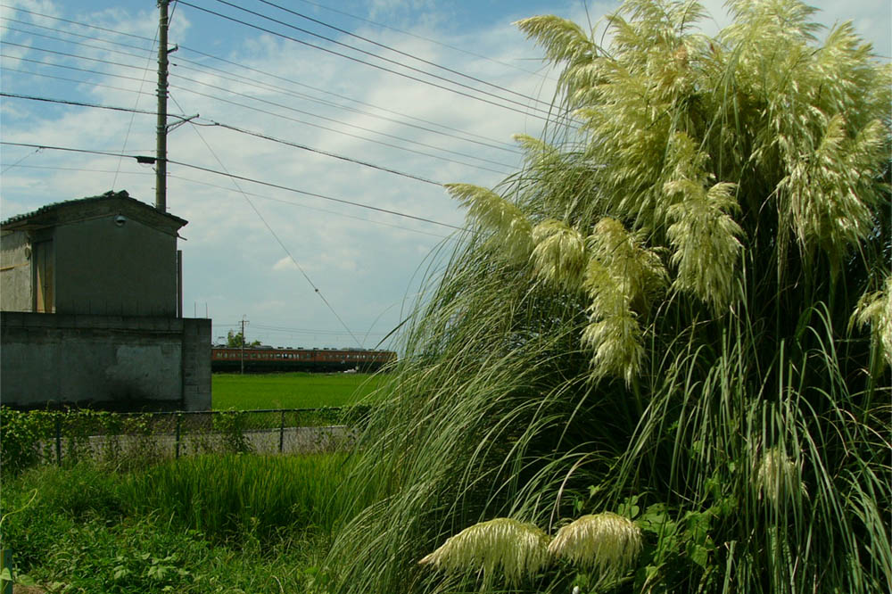 ![]() 水田脇で咲くパンパスグラス(前橋市下増田町) 2013/9/1 右後方の林は新土塚城跡・文殊山古墳(前橋市二ノ宮町) ![]() ちょうどJR両毛線の湘南型電車が通過。その昔、この辺に無人駅「下増田駅」がありました。 2013/9/1 |