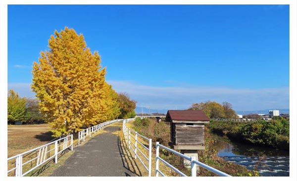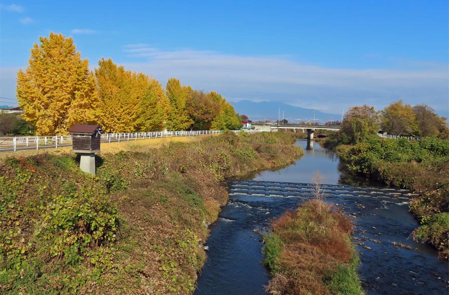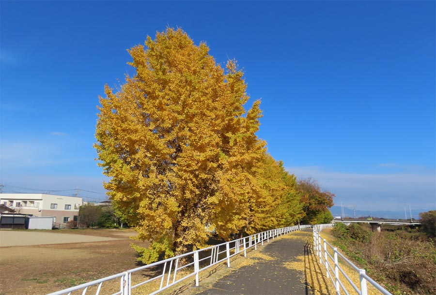 | 秋も深まり、テレビでは日本各地の黄葉便りが流れています。イチョウの定番は東京・神宮外苑のイチョウ並木。 ご当地伊勢崎市にも、公園や街路樹としてイチョウ並木は何か所もあり、当ページでもその一部を紹介しています。今回紹介するのは粕川右岸のイチョウ並木(伊勢崎市寿町)。堤防に沿った公園脇に立っています。すぐ南を東西に走る税務署通りを通過する車か、公園やサイクリングロード利用者でもない限り、なかなか気付かないような場所です。 ただ、西に公園広場、東に粕川が流れ、周囲に遮るものがなく、はるか後方には赤城山が横たわる、そんな場所に眩いばかりに黄葉するイチョウ並木は、わざわざ足を運ぶ価値があると思っています。(2025/11/29 記) |