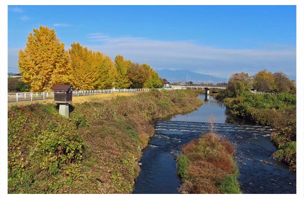 田園地帯のイチョウ伊勢崎市の波志江町北西部から神沢川を渡ると前橋市飯土井町に入り、のどかな水田や畑地が広がります。のんびりとサイクリングを楽しむには絶好の場所で、季節の折々には路傍に咲く山野草や様々な落葉樹が更に楽しみを加えてくれます。(2010/11/23 記) |