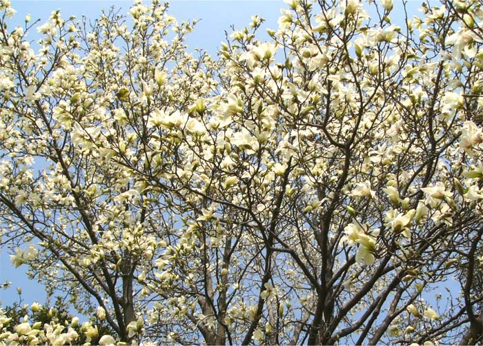 | 早春を告げるロウバイや梅・桃はそれぞれ全国各地に観光名所があり、サクラは開花宣言を待つ全国の話題が毎年賑やかで、ツツジや花菖蒲なども各地に観光名所があります。 ところがモクレンの観光名所の話はあまり聞いたことがありません。公園や個人のお宅の庭、畑地や空き地の隅などにこの時期に一斉に咲いて周囲を明るく照らしていますが、なかなか立ち止まって愛でている人の姿を見かけません。 まだ葉っぱが出る前のスラリとした木にミルク色の花弁をタップリと付けて空を覆う姿は、朱色や黄色などの華やかさはありませんが、その分、ちょっと控えめで、気品を感じます。(2010/3/24 記) |