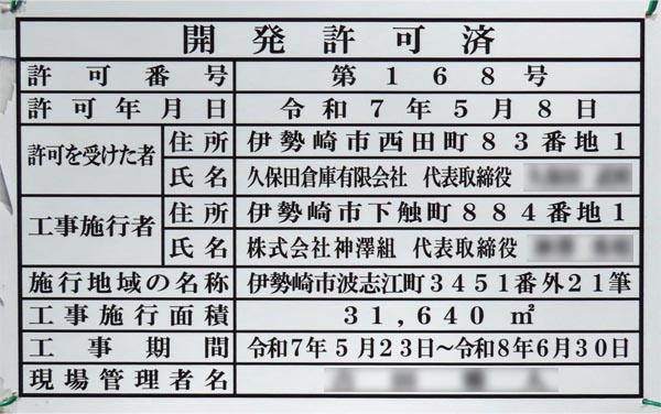 造成工事進む 2026/1/10北関東自動車・北側側道沿いの伊勢崎市波志江町で徐々に進む建設工事。前回紹介の波志江インター倉庫に続き、今回は久保田倉庫です。建設地は北関東道を挟んだ「赤城見台公園」北側の31,640平米。南西角地にはローソンがあります。工事前の建設地は水田で、稲作が行われていました。1月10日時点で、現場では埋め土と整地が進行中でした。窪んだ水田に埋め土を施し、周辺の道路と地盤標高を合わすようです。施工区域内を南北に走っていた伊勢崎市道((伊)1-557号線)は、今回の工事の関係で廃止になったようです。工事概要は下記の通り。 (2026/1/13 記) ■発注者:久保田倉庫有限会社(伊勢崎市西田町) ■工事箇所:伊勢崎市波志江町3451番 外21筆 ■施工面積:31,640u ■工期:2025/5/23〜2026/6/30 ■施工:株式会社神澤組(伊勢崎市下触町) ![]() 開発許可済票 |