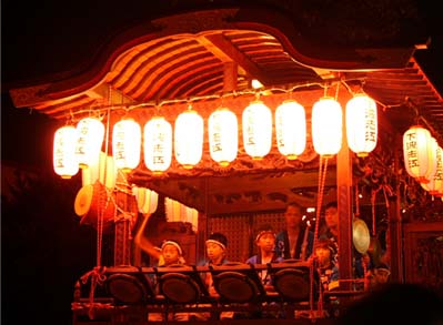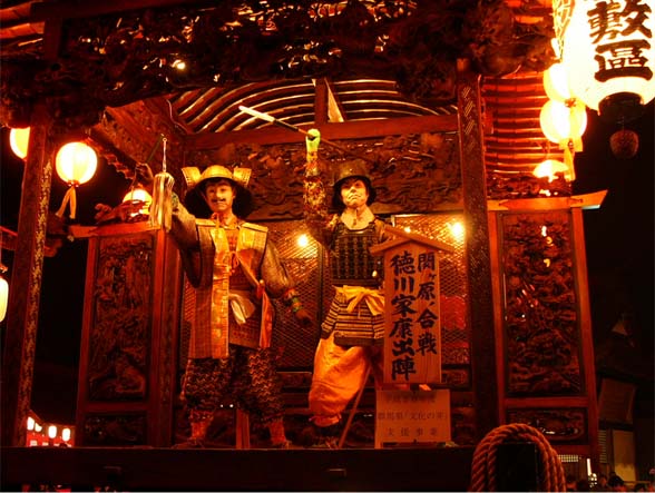 | 各屋台の背面には舞台があって、それぞれ歴史的な一場面が作られ、見事な彫刻が施されています。 | |