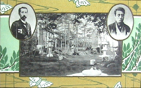 下城弥一郎氏 森村熊蔵氏記功建碑紀念絵葉書 左 下城弥一郎 右 森村熊蔵 後ろの庭園は現織物組合敷地北西 三光町武孫平氏寄贈絵葉書(伊勢崎市立図書館蔵) 絵葉書表紙(袋状) 絵葉書下段は「伊勢崎織物同業組合事務所」と記してある。