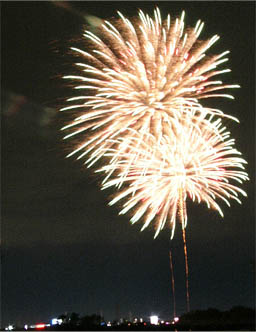 ![]() 大輪の花火が夜空を真っ赤に照らします ![]() クリームがかった黄緑色の花火 ![]() カラフルでゴージャスな花火 ![]() 風で流れた光の尾が不思議です |