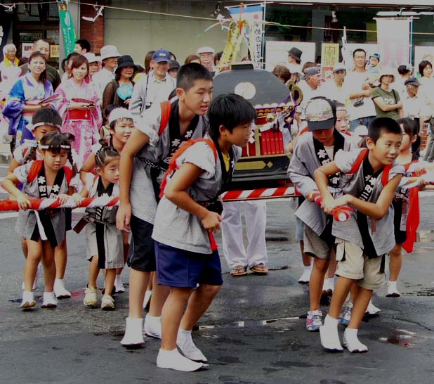 | ところで、子どもみこしの部の優勝はどこだったのかな? どのチームも元気一杯で、担ぎ方や揉み方、衣装など、それぞれに趣向を凝らしていて、甲乙付け難しでした。 幼稚園や小学校低学年と思われる担ぎ手は、見ているだけで可愛らしく、微笑ましい光景でした。 |