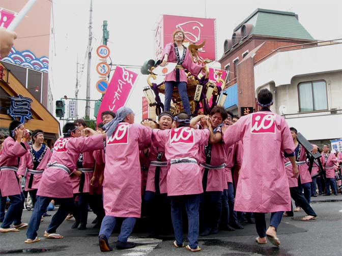 | 子どもみこしの後には大人みこしが続きます。参加チームは13チーム。本町通りの中央の交差点を境に東西に分かれての登場です。大人みこしは威勢の良さや迫力、リズムの取り方や掛け声のパターンの変化が魅力で、担ぎ手はもちろんのこと、周囲の見物人もいつしかその熱気や魅力に巻き込まれていました。 | ||
