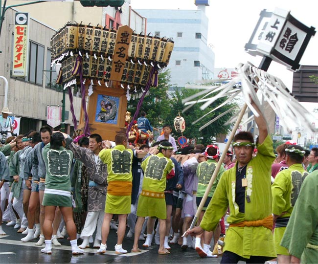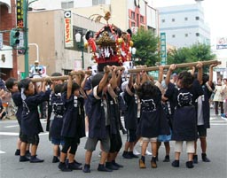 本町通りを埋めたダンピアいせさきが終わると、各地区から集まって来た屋台が一台、二台と通りに姿を現し、屋台囃子を演奏しながら流して行きます。夜の叩き合いと異なり、ゆっくりのんびりとしたひと時です。その時を過ぎると、百人みこしが満を持しての登場です。本町通りの東方から、長い行列が静々と進んで来ます。行列の後方に着いた神輿は大勢の担ぎ手たちが群がるように担ぎ、やがて伊勢崎神社に奉納されます。 |