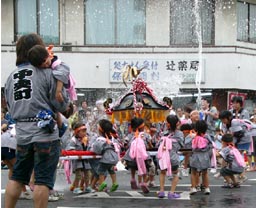 | 子どもみこしコンクールの参加チームは24。各チームが半被姿や担ぎ方、神輿、それぞれ趣向を凝らしてコンクールに臨みます。まだあどけなさが残る幼い子ども達が一所懸命にみこしを担ぐ姿は微笑ましく、思わず「頑張れ、頑張れ!」と声を掛けてしまいます。また、中には大人顔負けの逞しいチームもあって、会場を盛り上げます。 | ||