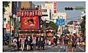 | 今年の屋台・山車の巡行競演は、過年度よりも行儀よく行われました。巡行後、本町通りの交差点に7台、8台の屋台が集結し、お囃子を競い合ういわゆる”喧嘩囃子”はなく、各町内の屋台・山車は所定の場所に留まって演奏しました。陣取りのトラブルを避ける配慮があったようです。 各区の屋台が本町通りの両端に一定間隔で縦列し、それぞれのお囃子を奏で続けるスタイルは、他区の演奏とも混じり合わず、落ち着いて品のいい雰囲気でした。交差点の中心に、熱い炎のようにエネルギーが集結する喧嘩囃子もよし、鎮守の森の祭りのように、静かにじっくりとお囃子演奏を楽しむもよし、様々なスタイルの夏まつりです。 |