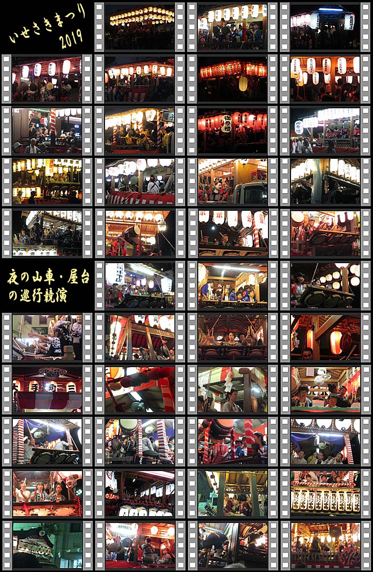 いせさきまつり・夜の山車・屋台の巡行競演は、初日の午後7時を少し過ぎる頃から始まりました。28区29台の山車・屋台が半分ずつ東西に分かれ、本町通りへゆっくり、ゆっくりと歩を進めます。トラック屋台の場合もエンジンを止め、区内の皆さんが綱を引いて引っ張ります。山車・屋台の舞台には各区の大人と子供が乗り、それぞれのお囃子を演奏します。昼間と異なり、周囲の景色が闇に包まれ、山車・屋台の提灯だけが明るく灯り、演奏者たちを照らします。31台の山車・屋台が本町通りを埋め、ゆっくりと巡行する光景は、荘厳な雰囲気さえ漂っていました。夜の山車・屋台の巡行競演 全29台太田町区、本関町区、波志江町二丁目中屋敷、上植木本町区、鹿島町中下区、三和町曙区、三和町堤区、波志江町一丁目稲間区、山王町区、三光町区、鹿島町植木区、豊城町区、寿町区、曲輪町三区、波志江町一丁目鍛冶原、馬見塚三ツ橋町区、南北千木町(2)、美茂呂町区、茂呂南町区、新栄町区、緑町区、馬見塚中町区、茂呂町二丁目区、波志江町一丁目宮貝戸、大手町三区、茂呂町一丁目区、本町一区、大手町四区 |
