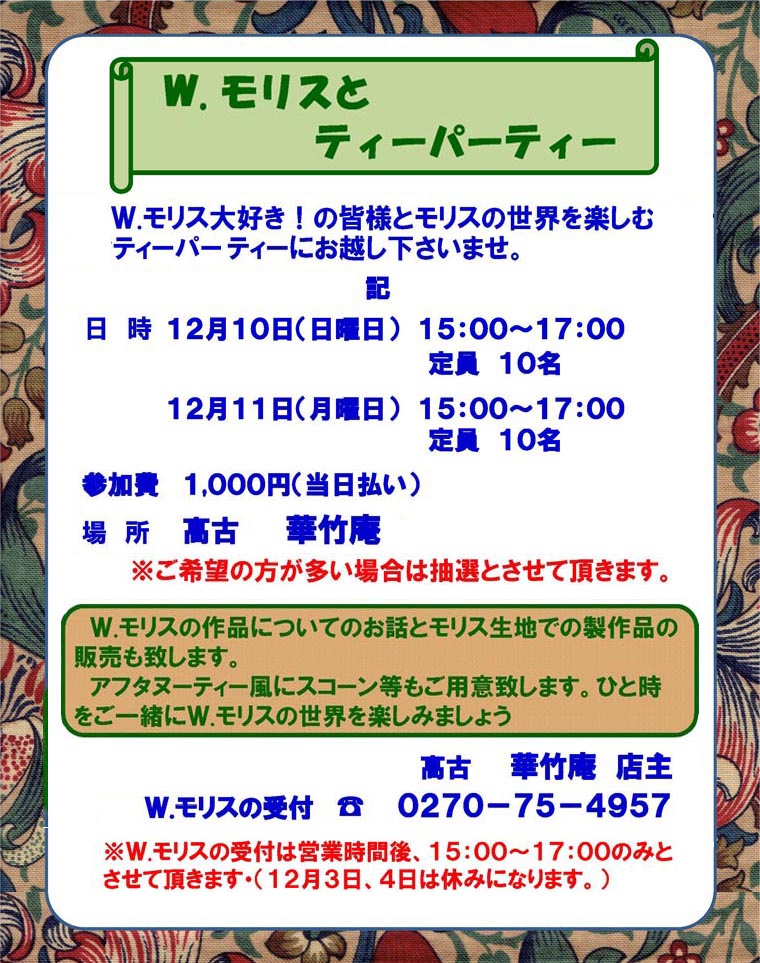 | 幕末築造の金井研香宅。奥の一室には俳人金井萬戸の書斎「華竹庵」があります。その建物を利用した蕎麦屋さん「華竹庵」の店主は、トルコ絨毯やペルシャ絨毯、キリム、海外の珍しい食器や生活用品、アンティーク家具など、様々なコレクションを持っています(→こちらで紹介)。その中で、ウィリアムモリスの布地や壁紙、またモリスの布地を使用した小物のコレクションも多く、モリスファンが多いことから、この度、展示即売会を開催することになりました。俳人金井萬戸の書斎「華竹庵」で催されるウィリアムモリスとアフタヌーンティーパーティー。師走の午後のひと時、お茶やお喋り、見学、買物など、ゆっくりと楽しまれてはいかがでしょうか。(2017/11/18 記) |