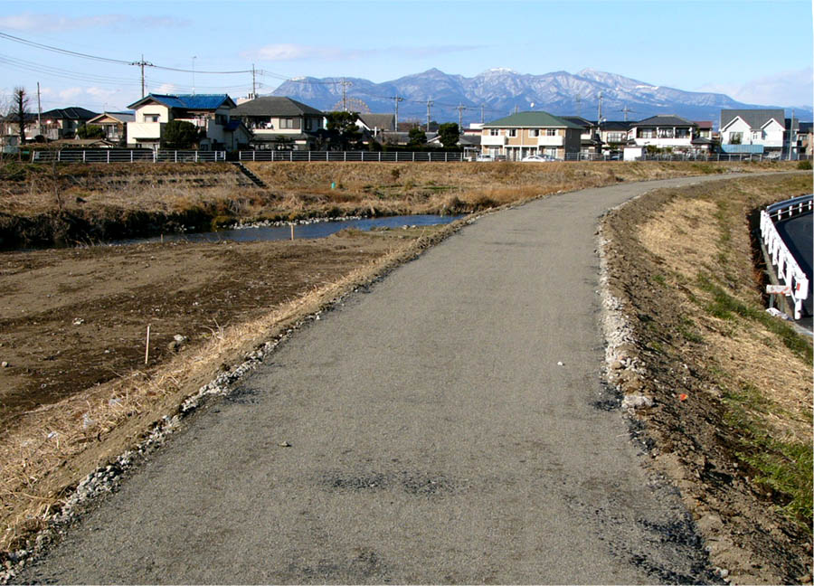 | 伊勢崎税務署の通りからJR両毛線までの左岸堤防上の道が簡易舗装を終えて開通しています。簡易舗装なので自転車で走ると弾力を感じますが、以前の未舗装のデコボコ道から比べれば格段に走り易いです。JR両毛線の高架橋の下には人道用のボックスカルバートが施工済みで、こちらも遠からず開通すれば、昭和町第五踏切まで遠回りせずに左岸堤防を走れることになります。(2011/2/15 記) | ||