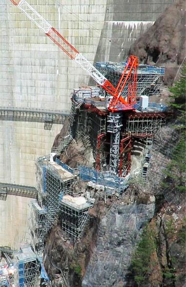 ![]() 駐車場〜ダムの途中からダム湖川を望む 2019/5/2 ![]() 右岸側岩盤に組み立てられた足場 2019/5/2 |