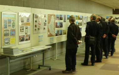 ![]() 受付準備完了 ![]() 早くも来場者が訪れました ![]() 展示パネルを見る来場者の皆さん |