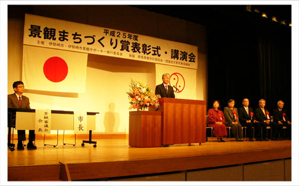 2014年1月23日(木)、午後1時半から午後3時半まで、境総合文化センター小ホールにおいて、平成25年度 景観まちづくり賞 表彰式・講演会が開催されました。![]() 景観まちづくり賞制度は今年で3年目。受賞者は個人部門としてヒロコドリームガーデンの金井尋子さん。団体部門として花・チョボラ他3団体が受賞しました(詳細下記)。伊勢崎市景観審議会会長・小林享氏の講評の後、景観啓発ビデオ「景観まちづくり〜魅力ある景観を創る・守る・育む〜」を上映。最後に景観まちづくり講演会として帝京大学経済学部観光経営学科教授・大下茂氏から「景観と観光の接点を考える〜景観は地域の品格の現れ〜」と題して講演が行われました。 以下、当日のレポートです。(2014/1/25 記) 【主催】伊勢崎市、伊勢崎市景観サポーター実行委員会 【後援】群馬県都市計画協会、関東地方都市美協議会 【担当部署・問い合わせ先】 伊勢崎市都市計画部都市計画課 〒372-8501 群馬県伊勢崎市今泉町二丁目410 |