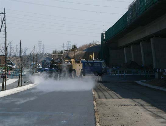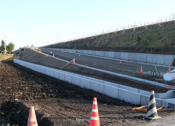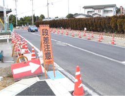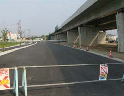 JR両毛線の跨線橋の西側区間の側道は、本線への工事車両出入り口に使用していたため、伊勢崎区間で最後まで残った場所ですが、その出入り口もほぼ役目を終えて、側道工事も急ピッチで進んでいます。JR両毛線を跨ぐので、その両端で坂になっています。(2008/2/15 記) JR跨線橋の西側でも、車道、歩道、路肩部共に路盤工まで仕上がっているようで、こちらも舗装まで後一歩と言った状況でした。これらの区間の側道は、3月8日の太田桐生ICまでの本線の開通以前に開通できそうな状況です。(2008/1/25 記) 2008/1/20、北関東の伊勢崎区間の側道工事は最後の追い込みの様子でした。 上武道路の五目牛交差点の北側では車道がほぼ完成し、歩道部も中央〜北側にかけては完成し、中央〜上武道路の交差点までの区間が路盤工や盛土斜面工を終えて、舗装まで後一歩の様子です。 2007/12/26 午後3時、側道が部分開通しますが、12月24日、その開通区間の西側のJR跨線橋付近を訪れてみると、盛んに工事を行っていました。この区間は本線への工事車両の出入り口に使用され、最後は舗装工事用トラックが引っ切り無しに出入りしていて、そのため最後まで側道工事を完成させることができなかった場所ですが、本線の舗装も終了した現在、いよいよ側道の工事を進めることができます。(2007/12/26 記) |