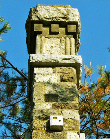 | 燈籠の高さは不明ですが、塔形状は下部から上部にかけて徐々に細くなっています。円柱で言えば、エンタシスのようです。基部を測定すると、断面形状は正方形で、一辺の長さ=75cmです。石造のため石面の凸凹がありますので、概略寸法です。 | ||