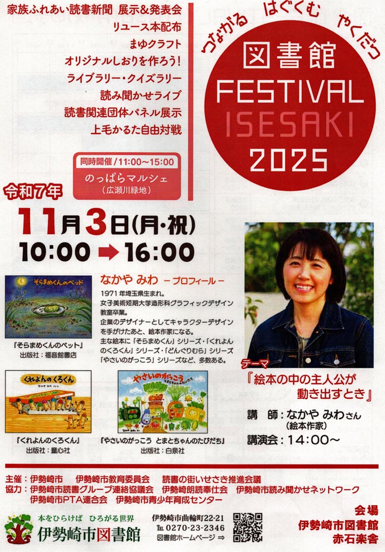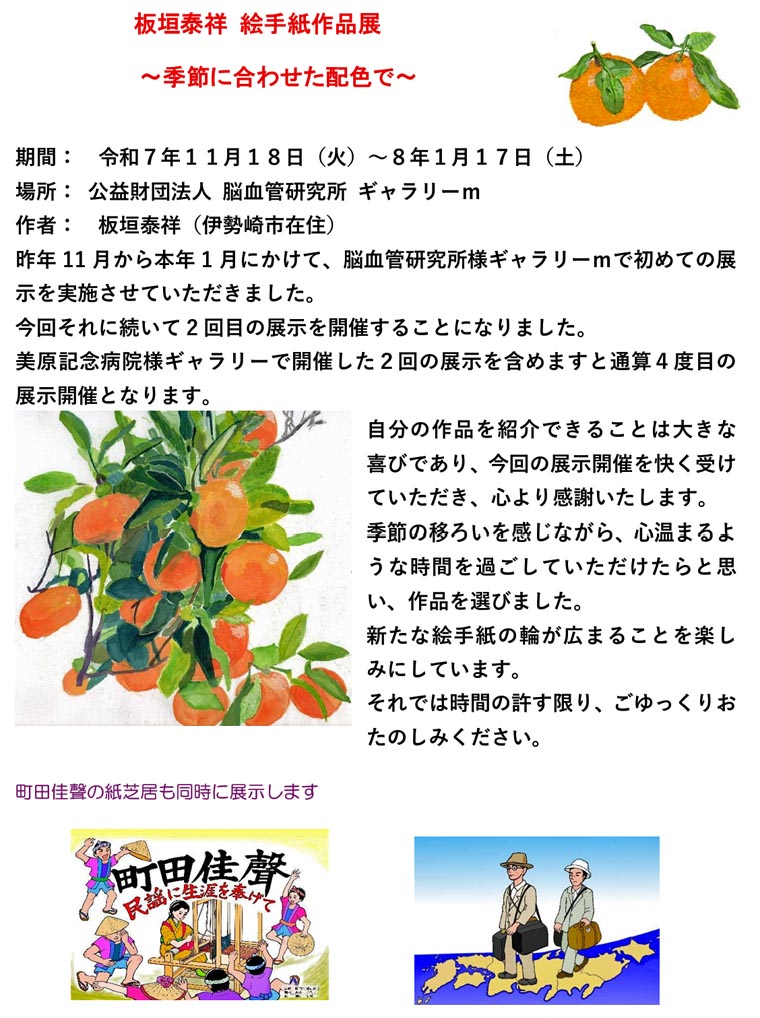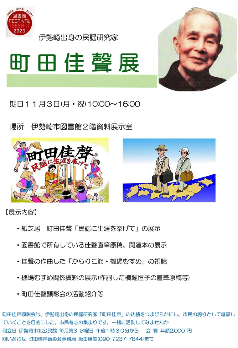 図書館フェスティバルで披露 2025/11/311月3日(月・祝)に伊勢崎図書館で開催された図書館フェスティバル「読み聞かせライブ」の中で、町田佳聲の紙芝居が実演されました。併せて2階調査研究室で、紙芝居の展示を中心に「町田佳聲展」を開催しました。1日だけの展示でしたが、三好教育長さん、伊勢崎民謡連盟会長の高野さん、剛志民謡保存会の皆さんをはじめ、多くの皆さんに来場していただきました。「紙芝居の展示が一日だけの展示ではもったいない」との声を数多くいただき、会員の友人が「板垣泰祥 絵手紙展」(*1)を開催することに併せて、「町田佳聲の紙芝居」を展示することになりました。 (2025/11/8 町田佳聲顕彰会) ![]() 図書館フェスティバルで紙芝居を実演 ![]() 「町田佳聲展」で紙芝居を展示する (*1)板垣泰祥 絵手紙展 ・会場:脳血管研究所 ギャラリーm(JR伊勢崎駅・南口駅前) ・期間:令和7年(2025年)11月18日(火)~令和8年1月17日(土) 板垣泰祥さんは、前伊勢崎管理公社職員で、青少年育成センター、文化会館、市民プラザ、赤堀図書館等に勤務。20年以上前から趣味で絵手紙を作成し、定年を契機に美原記念病院等で個展を開いています。 ![]() 町田佳聲展のご案内11月3日開催の図書館フェスティバルで、「まんてん紙芝居の会」の橋詰さんが「佳聲の紙芝居」を実演します。図書館2階資料展示室では、町田佳聲展を開催します。紙芝居の展示をメインに、佳聲の直筆原稿等も展示します。町田佳聲顕彰会