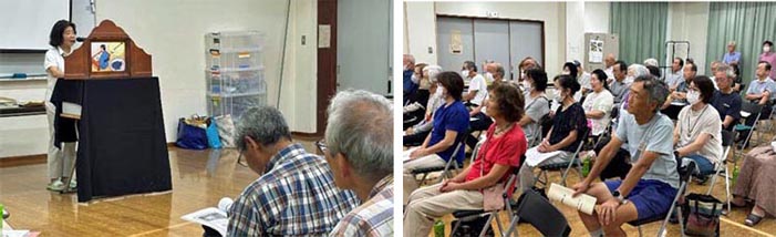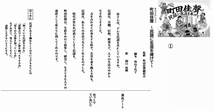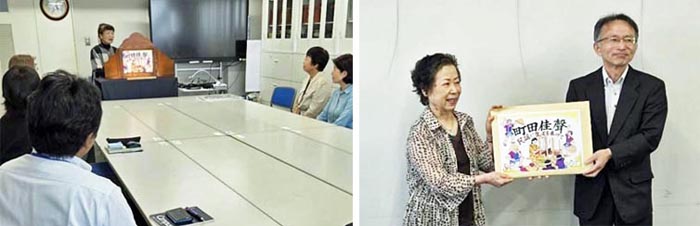 「佳聲」の事を多くの人達に知らせる手段として紙芝居を作ることになり、市内で紙芝居を作成して読み聞かせ等の活動している「まんてん紙芝居の会」の橋詰さんに相談したところ、西山千代子先生と関口眞純先生を紹介していただきました。 西山先生は元中学校の国語の教師で関口先生は小・中学校の元美術教師です。 今まで二人で幾つかの紙芝居を作成してきました。 西山先生が、武内 勉著「民謡に生きる」や佳聲の事を記した文献を参考に脚本を書き、二人でそれに合う絵の検討を重ねました。それを関口先生が挿絵に仕上げ12枚の紙芝居が完成しました。 8月19日に完成報告として、伊勢崎市教育委員会 三好教育長に実演を見ていただき、町田佳聲顕彰会として紙芝居をお渡ししました。 ![]() ![]() ![]() 紙芝居実演 贈呈 8月29日、殖蓮地区の生涯学習大会で「まんてん紙芝居の会」の発表の中で初披露する。 ![]() ![]() 西山先生から今回作成した紙芝居を使い、演じるポイント等を指導してもらう。 子ども用の脚本も西山先生が創ったので、関口先生から台紙に絵を貼る手順等の説明を受けた後に「まんてん紙芝居の会」の皆さんの協力を得て、子ども向けの紙芝居を作成する。 ![]() ![]() 町田佳聲顕彰会 |