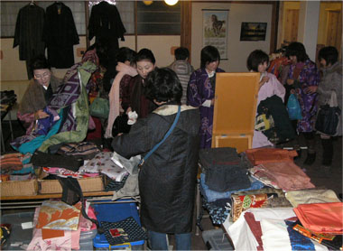 ![]() 通路も人で溢れます。 ![]() 手に取って着物を吟味する来場者 |