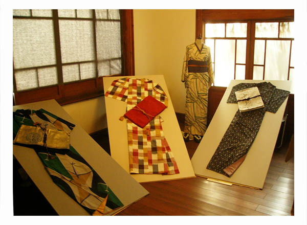 ![]() 玄関室隣の洋間に展示された「きじま銘仙」の着物 |