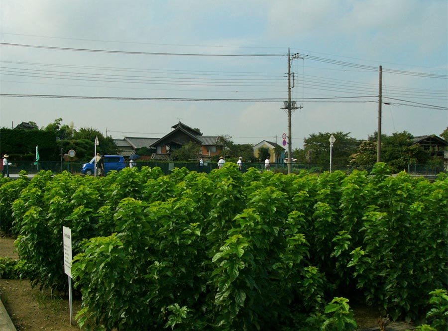 | 伊勢崎市で桑の木を語る時、島小(伊勢崎境島小学校)の南西側にある桑畑を紹介しない訳には行きません。 この桑畑は面積が500平方メートルあり、世界遺産登録を目指す地元の住民団体「ぐんま島村・蚕種の会(さんしゅのかい)」(田島健一会長)が、2008年に群馬県各所を会場として開催された「全国都市緑化ぐんまフェア」(→伊勢崎会場の様子はこちら)を記念に植え付けたもの(*)で、蚕種、養蚕で隆盛を極めた島村の原風景をよみがえらせ、また島村地区の散策コース上にも位置し、島小の養蚕授業の桑として提供されるなど、島村の養蚕農家群同様、島村にとって重要な桑畑です(2013/8/1 記)。 →島村特集のページはこちら (*)桑の苗木は、全国都市緑化ぐんまフェア・前橋公園会場の「桑の海」に植えられたものをフェア終了後に500本譲り受けたものとのこと。 |