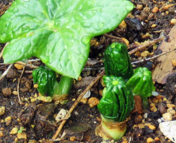 辺長33cmの正方形鉢のハッカクレン、成長記録ハッカクレンの花が咲きましたハッカクレンの花が咲きました。4月28日に確認した薄緑色の卵状の蕾は、全て”がく”に包まれた姿でした。![]() 蕾が膨らみ始め、花弁が赤く変わったことを確認したのが4月30日。この時は花弁は”がく”に半分包まれていました。次に確認したのが5月2日。この日には”がく”が落ちていて、花弁も丸く膨らんでいましたが、下向きなので雄しべや雌しべの様子は確認できません。 その後5月3日と5月6日に観察すると、”がく”は蕾の膨らみと半比例して萎んで小さくなり、やがて落ちたようです。 葉っぱが非常に大きく、それに比して小さな花。でも葉も花も艶々として個性的なハッカクレン。今年は鉢植えでも立派に育ってくれましたが、来年はどうなるでしょう。水あげや施肥、根分けなど、時々世話をしましょう。(2024/5/7 記) ![]() 上から見ると葉に覆われて見えません 2024/5/7 ![]() 開花が進むと”がく”が萎んで落ちますが、花弁は下向きのままなのが残念。 2024/5/6 ![]() 咲いたのは4つ。全ての花弁が赤く変わりました。 2024/5/6 ![]() 花弁が丸く膨れましたが、中の様子は分かりません。 2024/5/3 ![]() ”がく”が落ちました 2024/5/2 ![]() 葉っぱの大きさに比べて、花は小さい。 2024/5/2 ![]() 花弁が下向きなので、アップで撮っても雄しべ雌しべが確認できません。 2024/4/30 ![]() 大きな”がく”に包まれ、花弁が赤く変わりました。 2024/4/30 2024/4/28![]() 株数が多い分、養分を分け合ったようで、個々の成長がイマイチ 2024/4/28 ![]() 蕾が2枚の葉のつけ根部に付いているので、「タイワンハッカクレン」のようです。 2024/4/28 ![]() 確認できた蕾は3つ 2024/4/28 2024/4/24![]() 葉っぱが出揃いました 2024/4/24 ![]() こんな場所に置いてあります。午後半日陰になります。 2024/4/24 鉢で育てないと、周囲のクリスマスローズ等の成長に負けてしまいます。 2024/4/19![]() まだ芽吹きが続いています 2024/4/19 2024/4/16![]() まだまだ発芽中 2024/4/16 2024/4/14![]() 次々に発芽中 2024/4/16 2024/4/12![]() 発芽直後の葉っぱは緑が濃くて艶々しています 2024/4/12 ![]() 周辺では峠を過ぎたクリスマスローズが勢力拡大中 2024/4/12 2024/4/8![]() 芽吹き始めはキノコのような形です 2024/4/8 ![]() 芽吹きが始まりました 2024/4/8 |