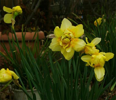 | 我が家で咲く水仙は4種類。以前は更に2種類あったのですが、いつの間にか消えてしまいました。これ以上増えなくてもいいと思う種類がどんどん増えて、増えて欲しいのが消えしまって、なかなか思うようには行きません。人生と同じ。 | |